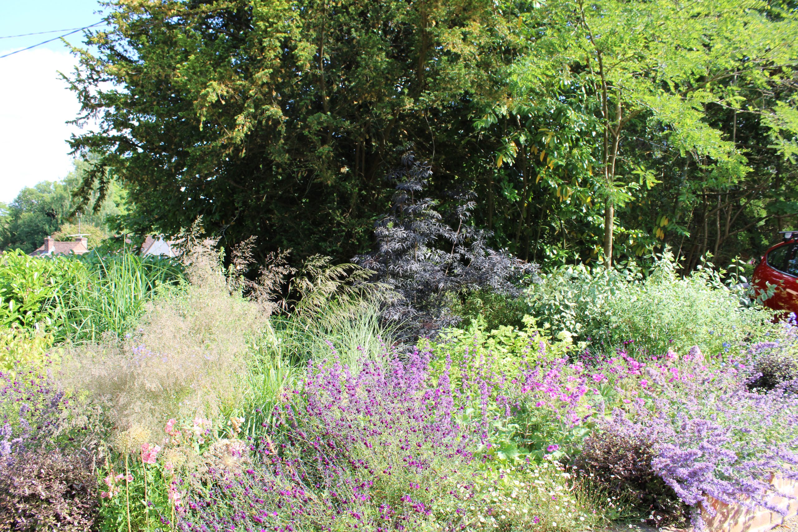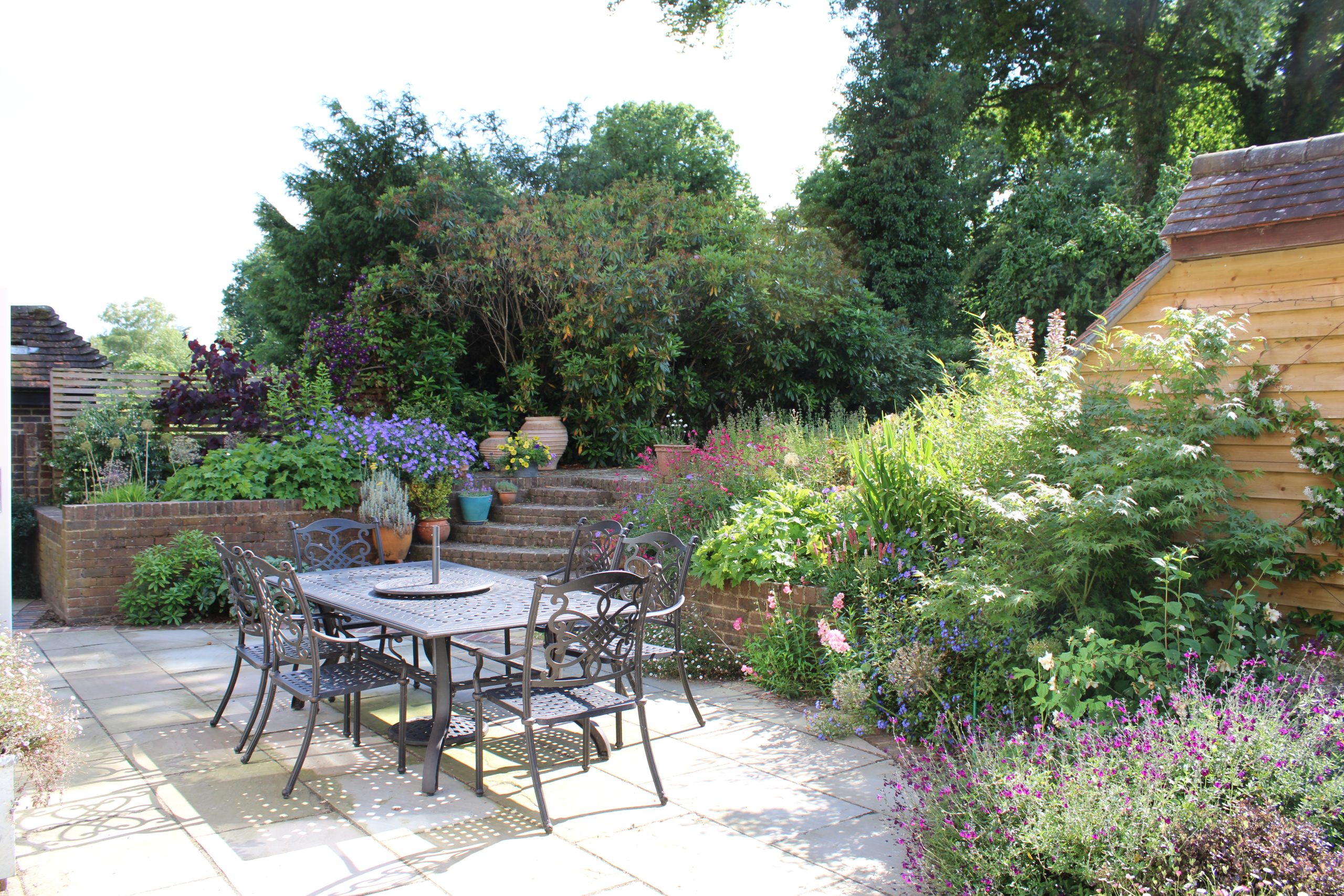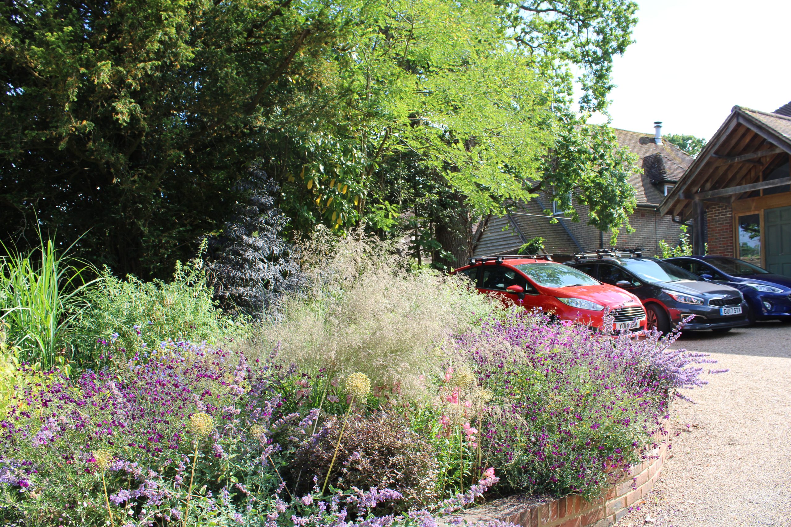A modern, medium-sized garden designed to sit seamlessly alongside a contemporary oak-framed building, with substantial planting to both the front and rear enhancing the architecture and softening its clean lines. The garden feels natural, balanced, and confident, allowing the warmth of the oak to take centre stage.